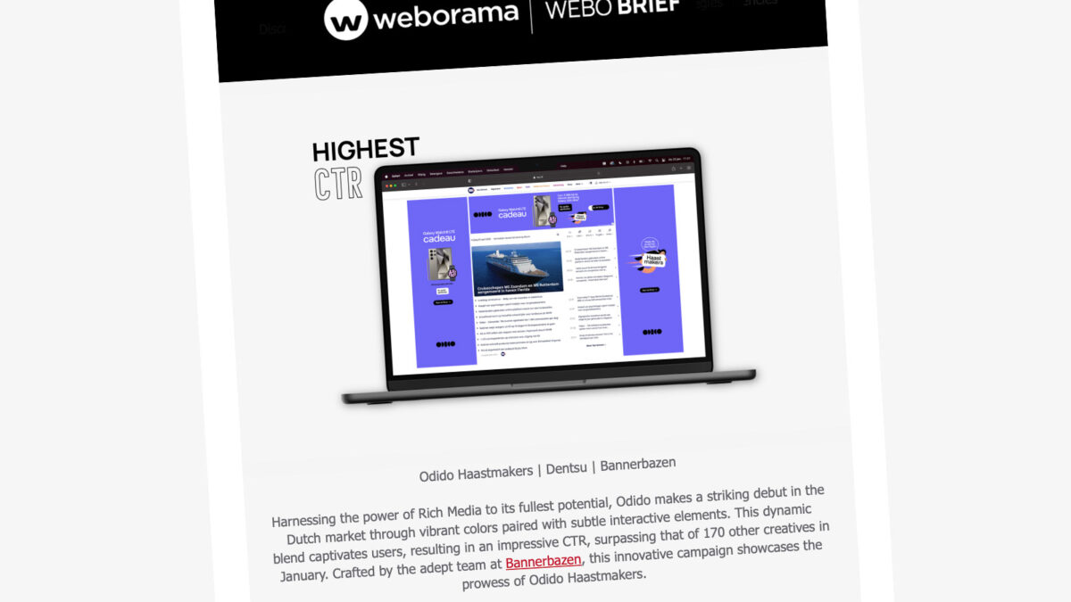 Thanks to Homepage Takeovers and BannerBazen, Odido Haastmakers dominated the Dutch Internet with vibrant colors and subtle interactive elements, leading to an impressive CTR, surpassing the more than 170 other RichMedia creations within Weborama’s platform in January.